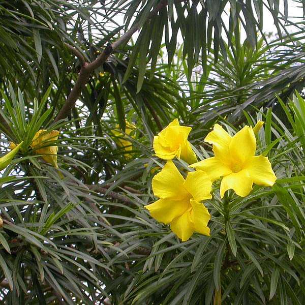 Cascabela Thevetia, commonly known as Yellow Oleander or Bitti, is a tropical shrub that is admired for its striking yellow flowers and lush foliage. The plant produces large, trumpet-shaped yellow flowers, which bloom in clusters, creating a beautiful contrast against its dark green leaves. While ornamental, it?s important to note that all parts of the plant are toxic if ingested. The Yellow Oleander grows as a shrub or small tree and can reach up to 6 meters in height. It thrives in full sunlight and well-drained soil, making it ideal for tropical and subtropical gardens.
