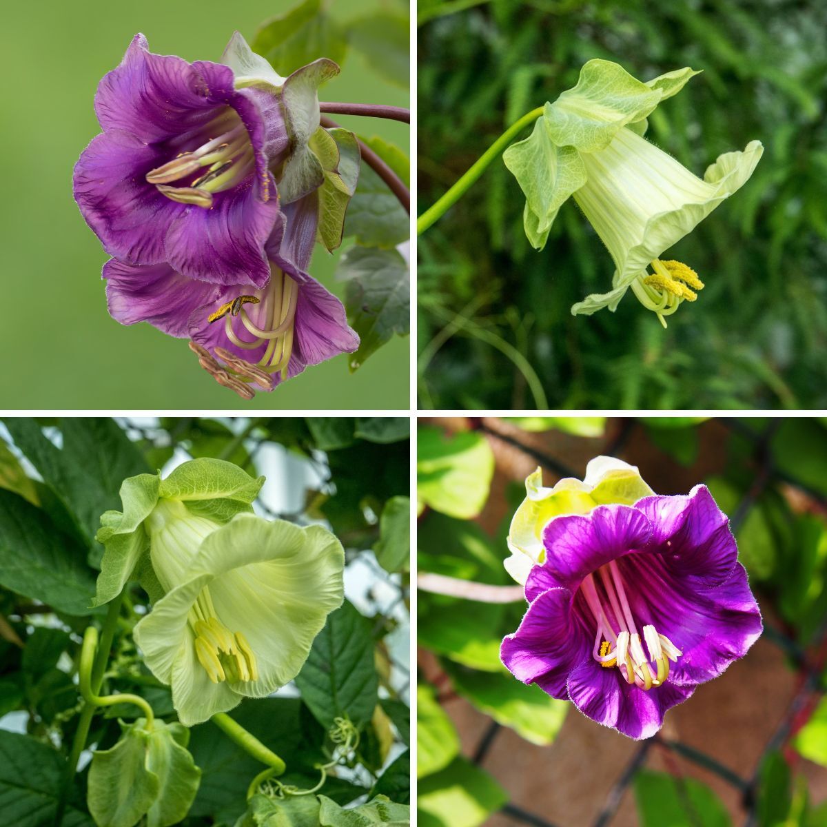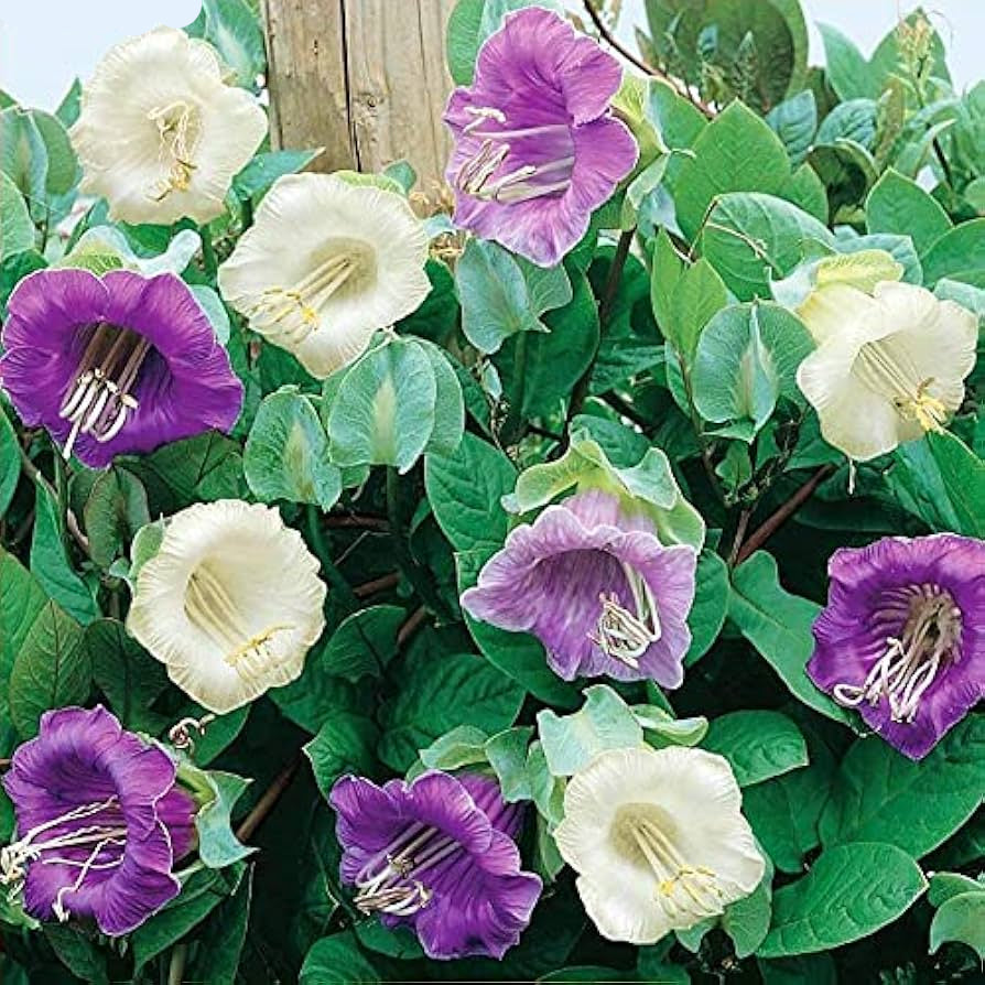 1. he Cathedral Bells Mix showcases an enchanting blend of bell-shaped flowers in vibrant shades of purple, white, and pink. Known for its fast growth and striking appearance, this climbing vine adds vertical beauty to gardens, trellises, fences, and arbors. Its eye-catching blooms attract pollinators, making it an ideal plant for gardeners looking to create a beautiful, fragrant vertical garden.