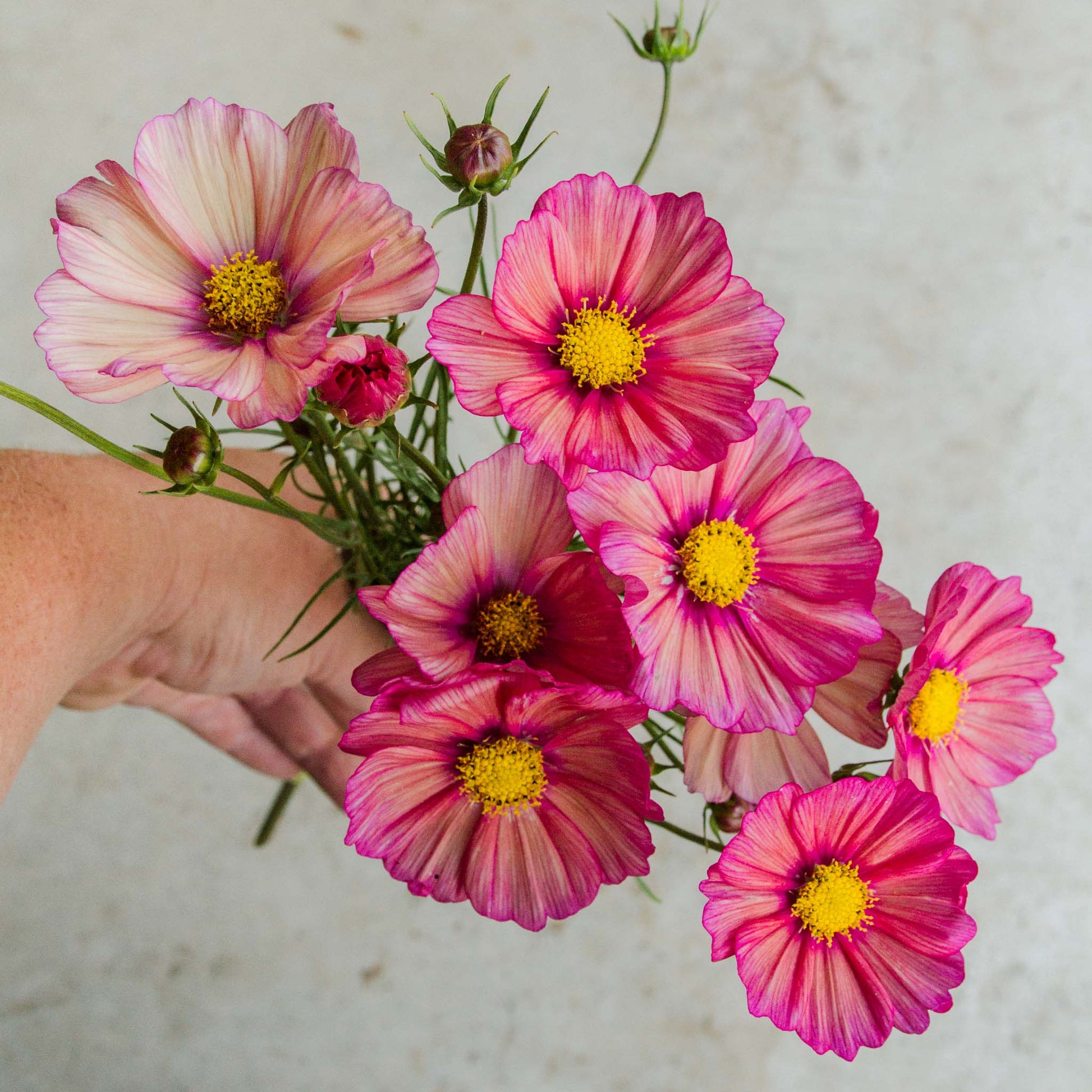 Cosmos - Xsenia is a stunning variety of cosmos that combines elegance with durability. Featuring large, vibrant pink and purple blooms, this plant is sure to stand out in any garden or floral arrangement. With its airy and delicate appearance, it thrives in full sun and attracts butterflies, bees, and pollinators, making it a fantastic addition to eco-friendly gardens. The Xsenia cosmos is known for its long-lasting, striking flowers that bring a touch of bold color from summer through fall.