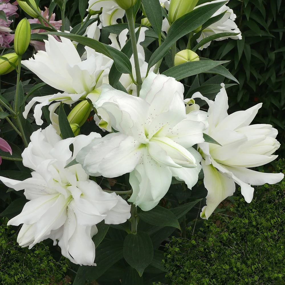 Gorgeous, Vibrant Blooms: The Lotus Beauty Lily blooms with large, bold flowers in radiant hues, often in shades of pink, yellow, or white, providing an eye-catching contrast against its rich green leaves.