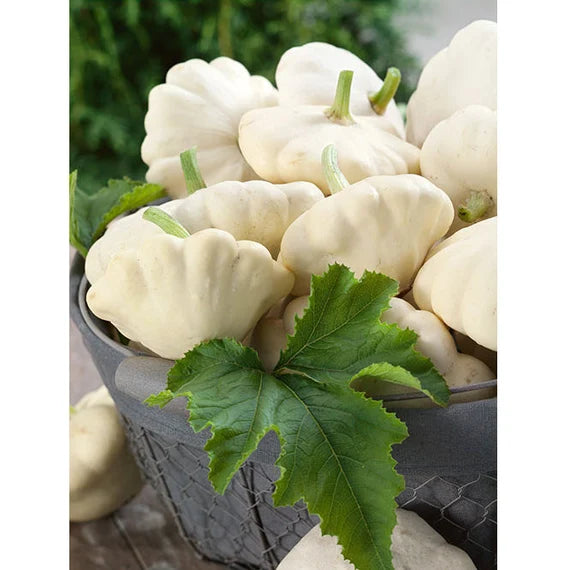 - Shape: Round, scalloped, white squash that adds a unique, decorative touch to the garden.