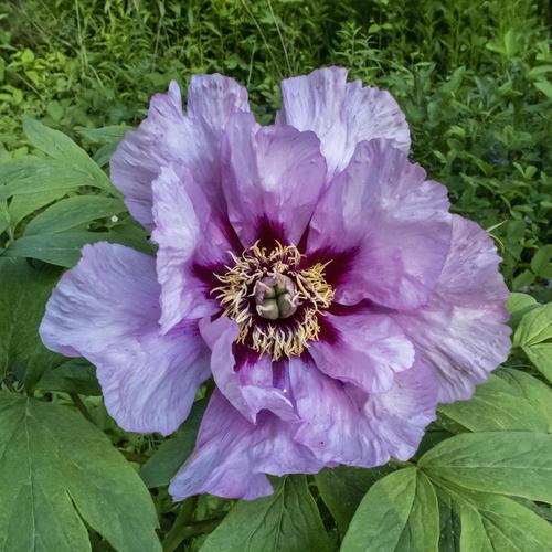 - Vibrant Coloration: The distinctive color palette of the Vintage Rockii-Flare peony includes deep violet, lavender, and creamy white tones, with bold red flares at the center for a truly eye-catching display.